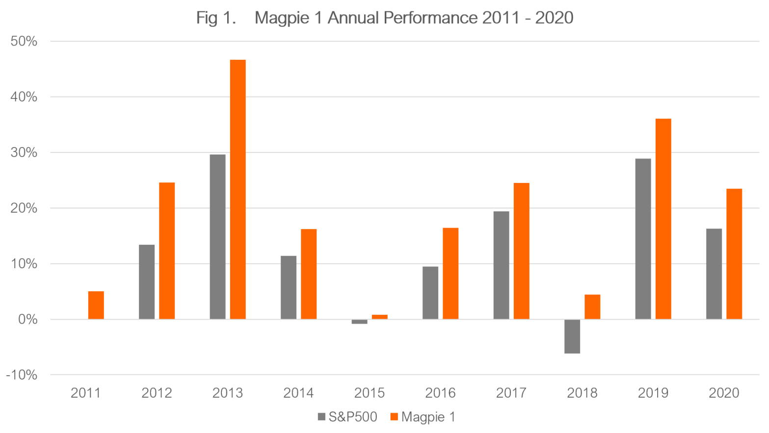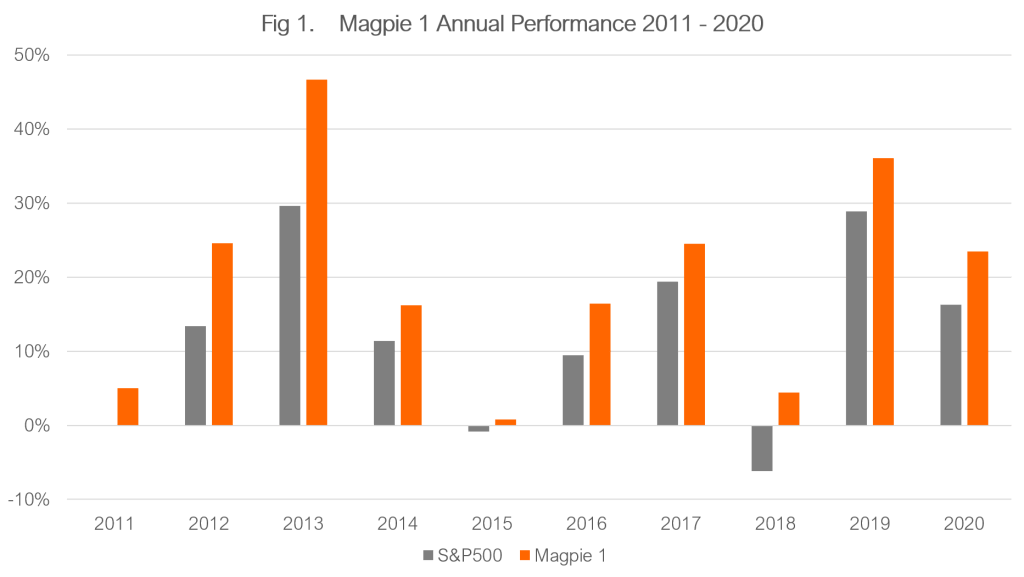 The strategy has now worked well for ten years and not once has it underperformed the S&P500 Index. It does not race away from the index but seems to generally outpace it by a comfortable margin each year. Since the beginning of 2011 the S&P500 Index had risen by 198% departing 2020 while the cumulative growth in Magpie 1 was 565%. Not bad for a sit and wait approach.