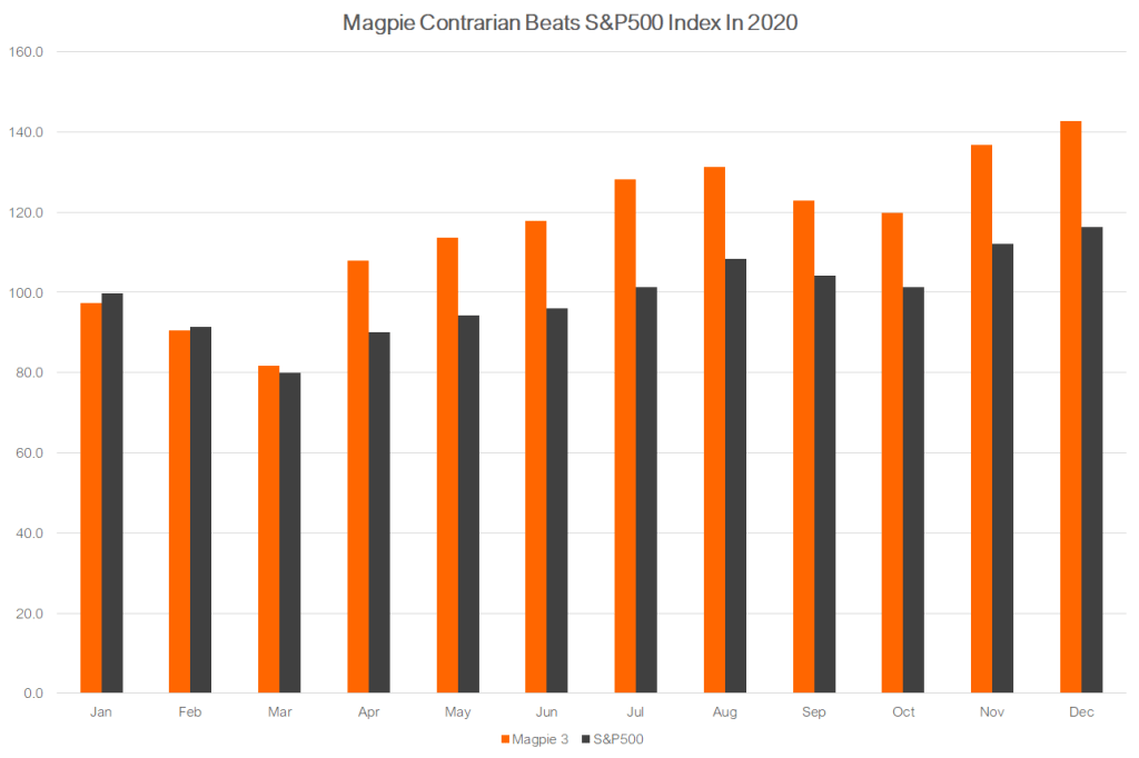 So, does this contrarian approach have any legs to it? It has beaten the index in 4 out of the last 6 years. While the S&P500 Index has returned 82% since the start of 2015 through to the end of 2020, Magpie 3 has delivered 127% in the same period, despite 2 underperforming years.
